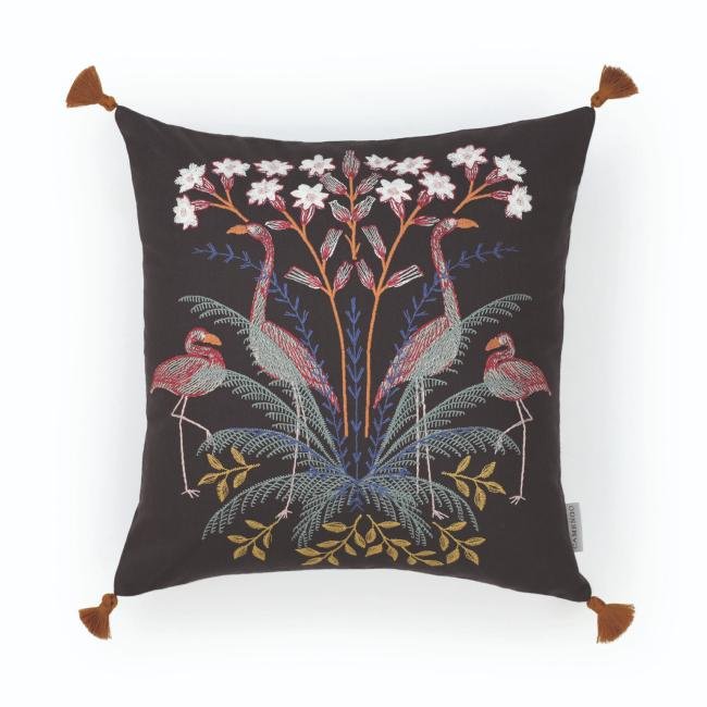 Coussin en coton brodé motif flamands roses fond noir
