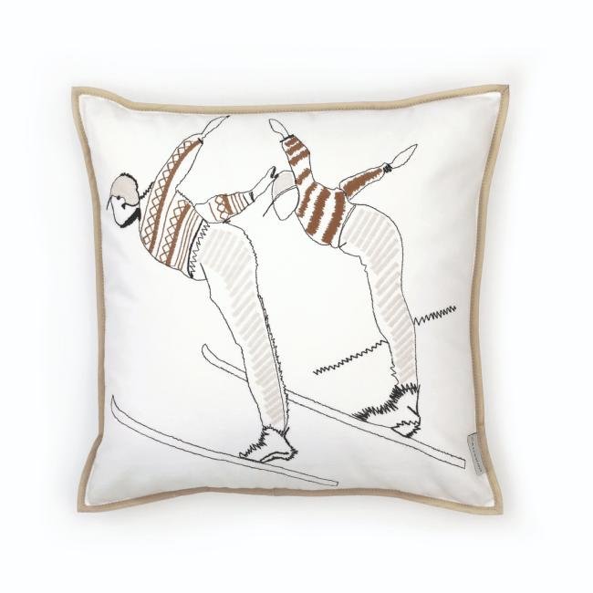 Ce coussin affiche un style graphique fantaisie avec son motif brodé de skieurs stylisés.