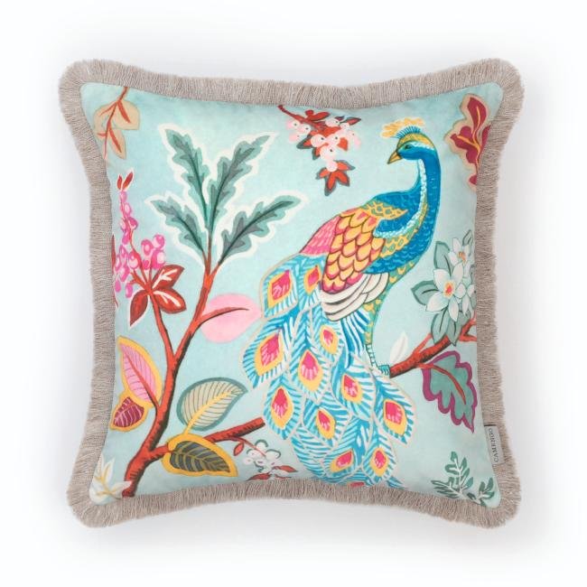Coussin en velours lisse imprimé multicolore avec finition franges esprit lin.