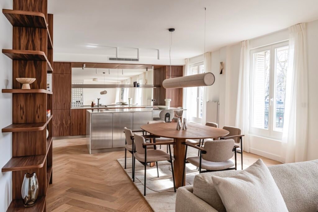 L’appartement disposait d’ouvertures aux proportions uniques, ce qui a nécessité une prise de mesures très précise est la création de rideaux sur mesure. Les hauteurs et largeurs ont été soigneusement adaptées pour un tombé parfait, valorisant l’élégance des espaces.