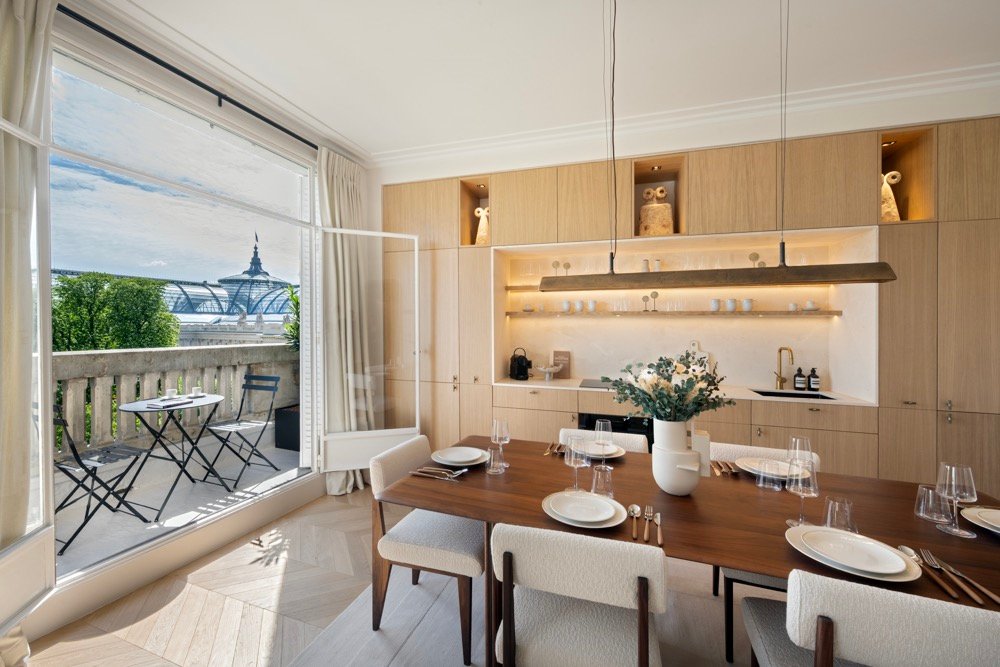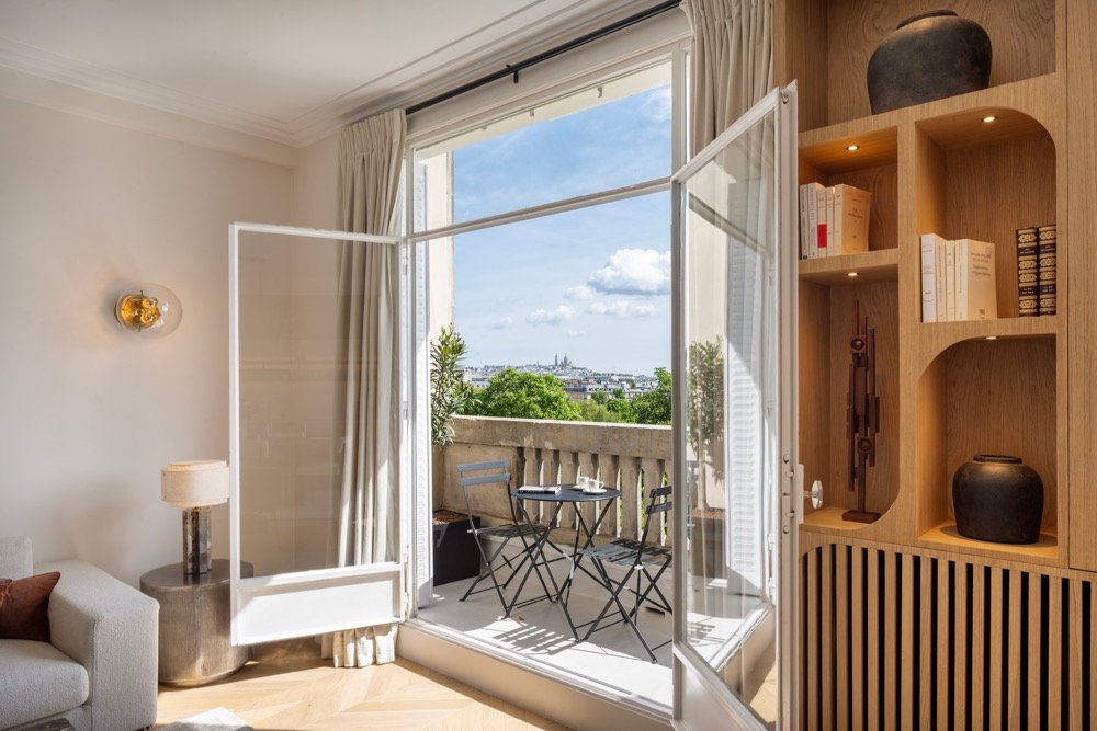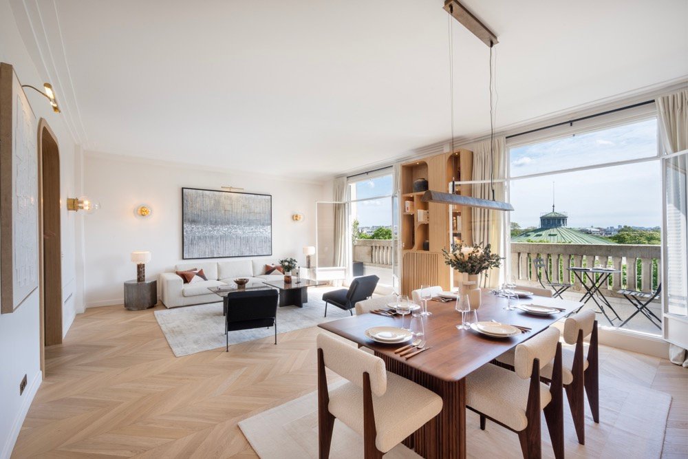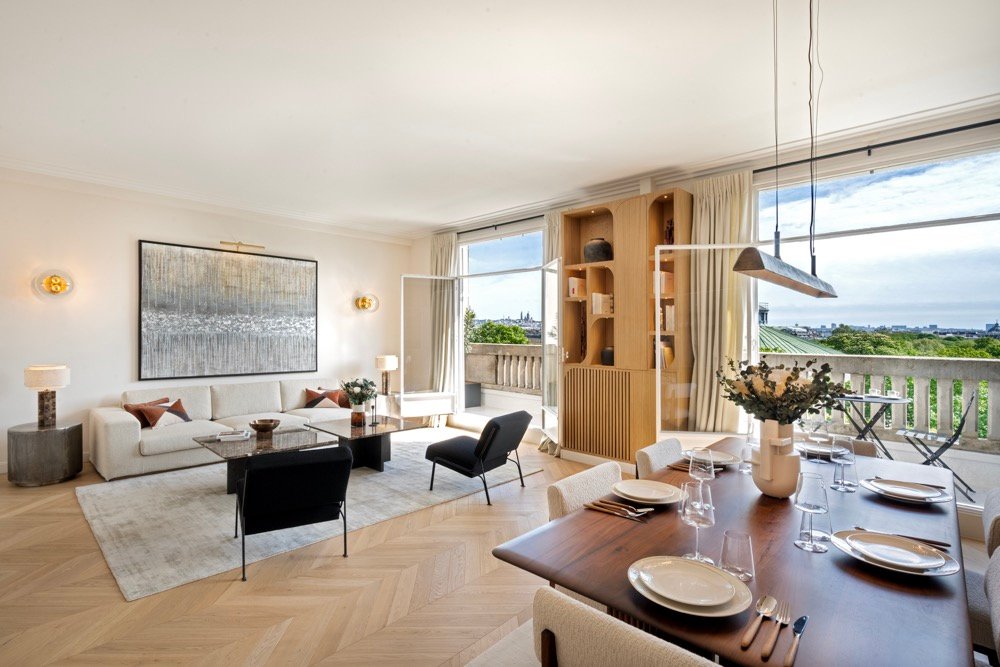 L’appartement disposait d’ouvertures aux proportions uniques, ce qui a nécessité une prise de mesures très précise est la création de rideaux sur mesure. Les hauteurs et largeurs ont été soigneusement adaptées pour un tombé parfait, valorisant l’élégance des espaces.